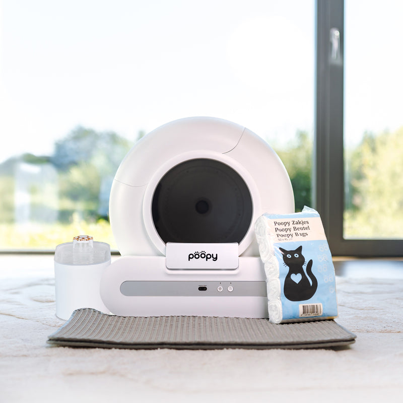 Ontvang 100 afvalzakken, een luxe kattenbakmat en een Poopy Flow drinkfontein.
