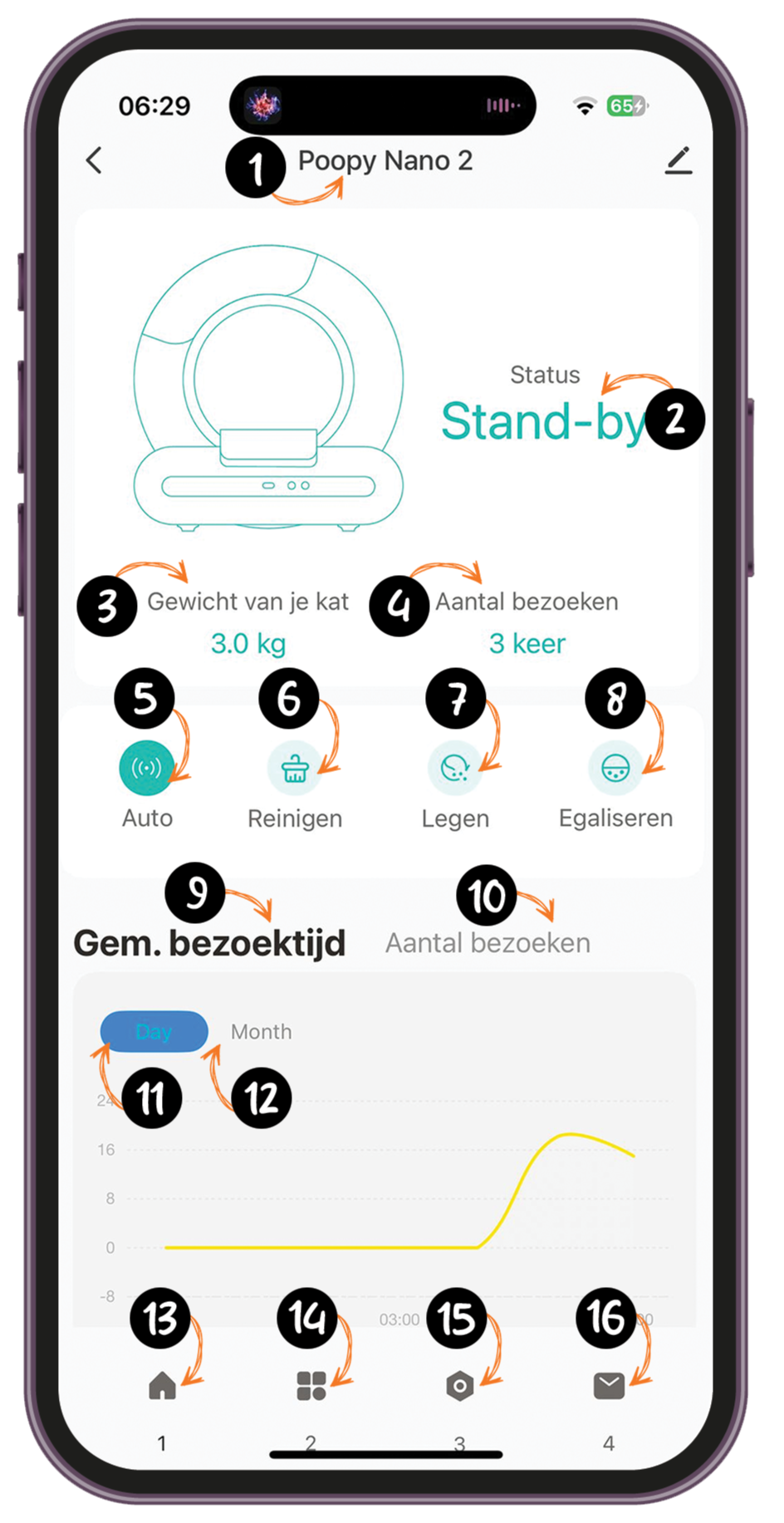 De huidige status van de Poopy Nano 2. In de standby-modus is de kattenbak niet actief bezig met reinigen, legen of egaliseren en staat hij klaar voor gebruik. Dit betekent dat de bak klaar staat voor de volgende keer dat je kat hem gebruikt.