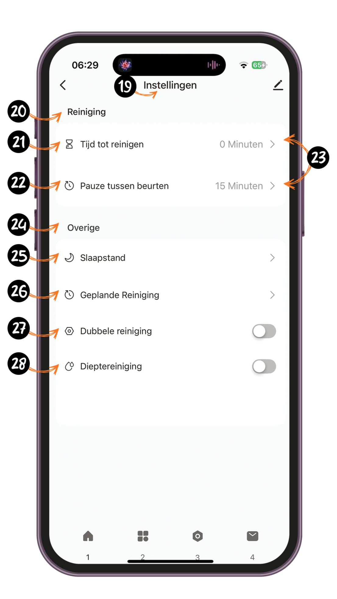 Dit zijn de tijdsopties die je kunt instellen voor de "Tijd tot reinigen" of de "Pauze tussen beurten". Kies de gewenste tijd om de reinigingscyclus naar jouw voorkeur aan te passen.
