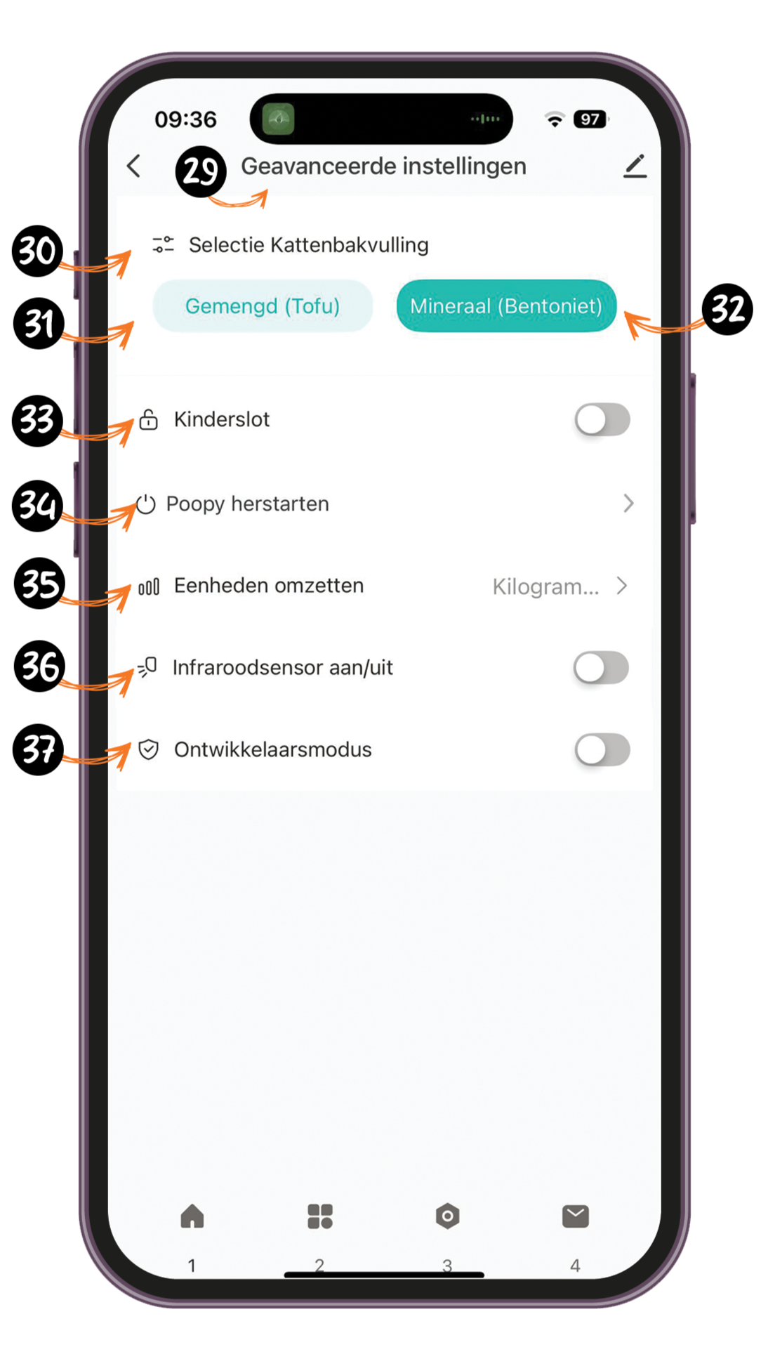 Extra instellingen die de Poopy Nano 2 biedt om de werking de kattenbak verder te personaliseren.