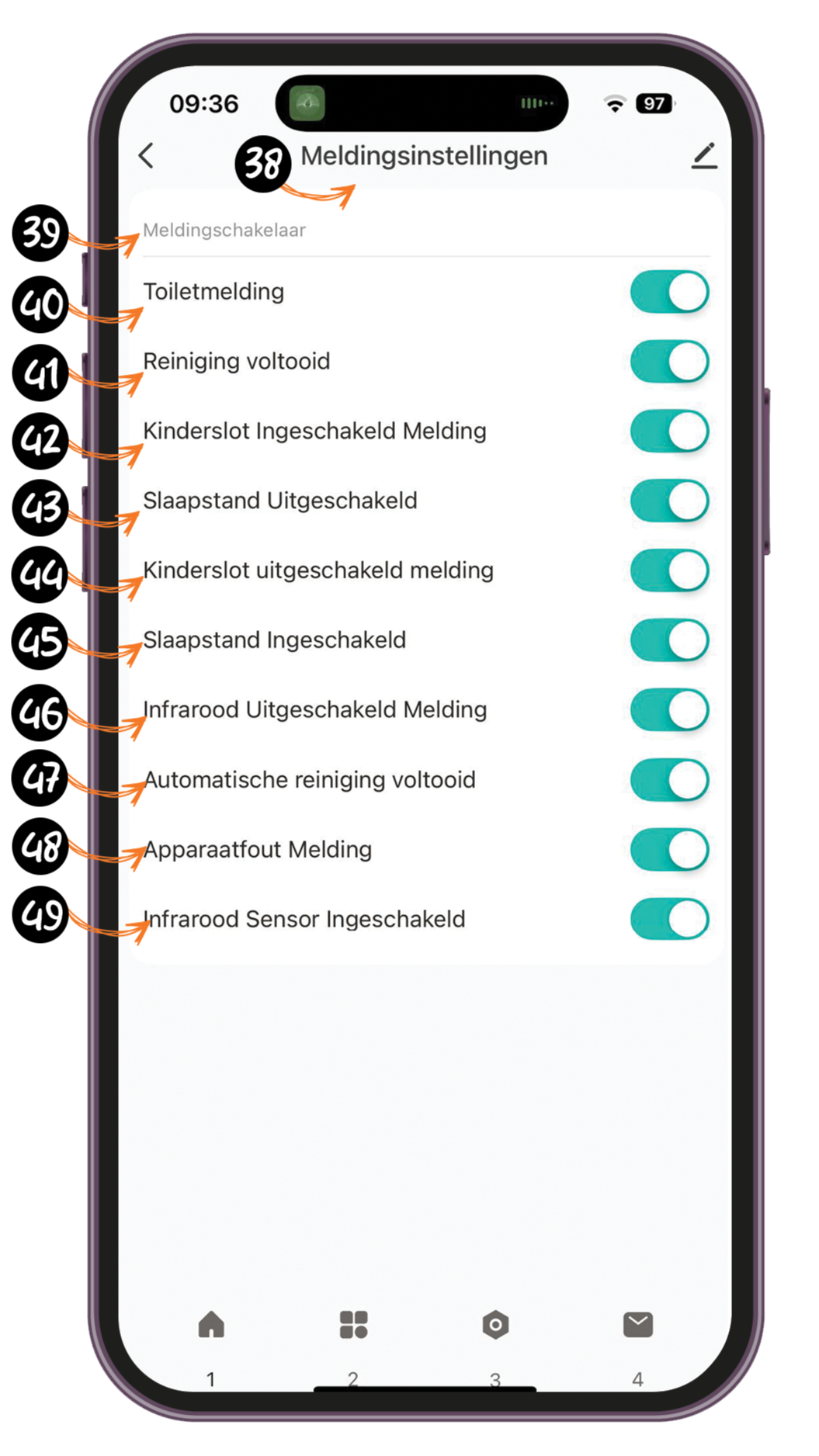 In de meldingsinstellingen kun je kiezen welke meldingen je wilt ontvangen over de status van de Poopy Nano 2.
