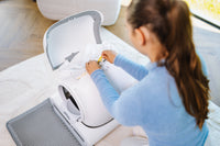 Steek de stekker in het stopcontact, vul met grof klontvormend grind of Poopy Grit en je bent klaar. De app is optioneel.