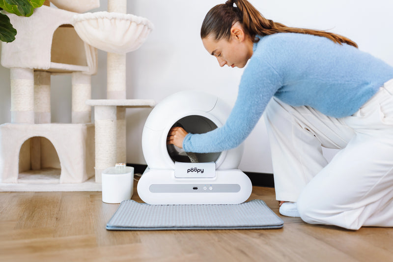 Elke kat is anders. De meeste katten accepteren de Poopy snel, maar sommige hebben wat tijd nodig om te wennen aan het automatische schoonmaakmechanisme. Introduceer de Poopy daarom rustig en stapsgewijs.